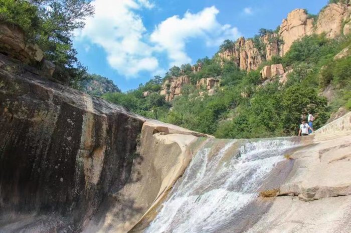 新线路位于园门左手边,步行20分钟,一处小型二级连瀑便映入眼帘,几块石块排布其上,将完整的瀑布纵切若干小段,很有趣味。