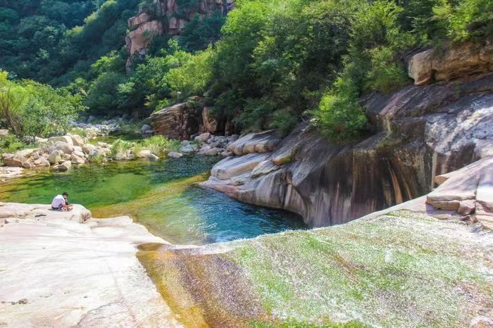 继续向前,一潭葫芦形的碧水映入眼帘,清澈晶莹,巨石天然形成光滑的凹面,这真是大自然的鬼斧神工!