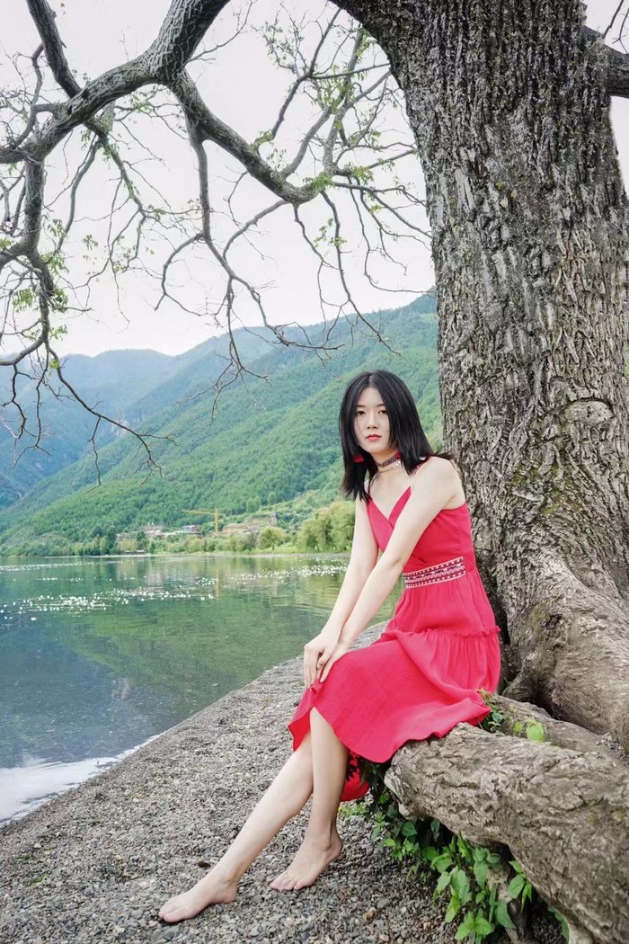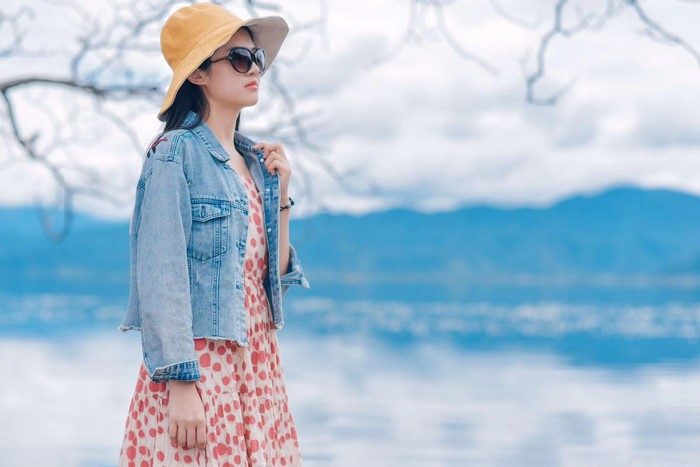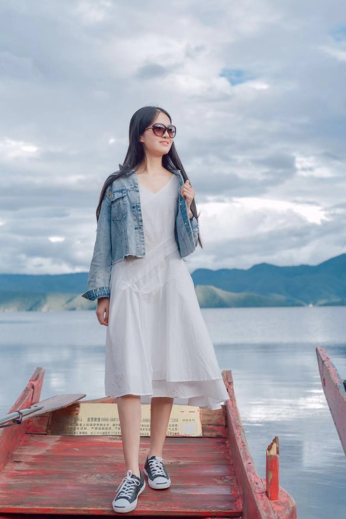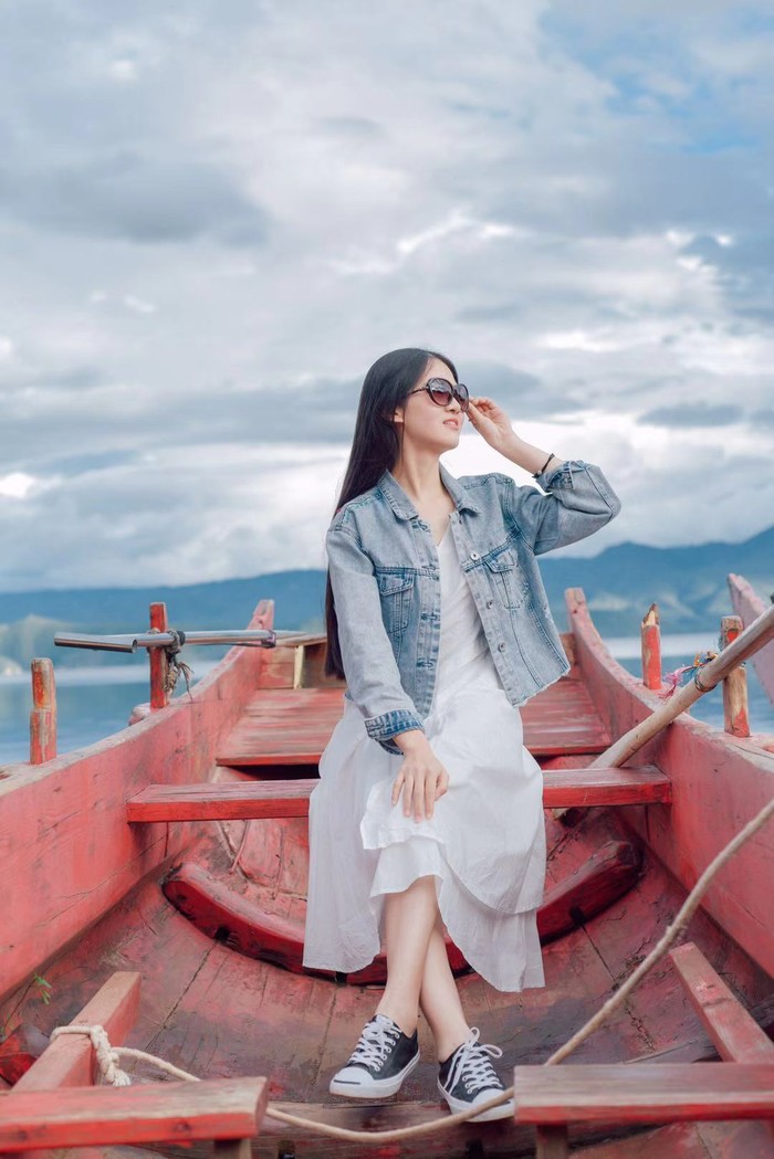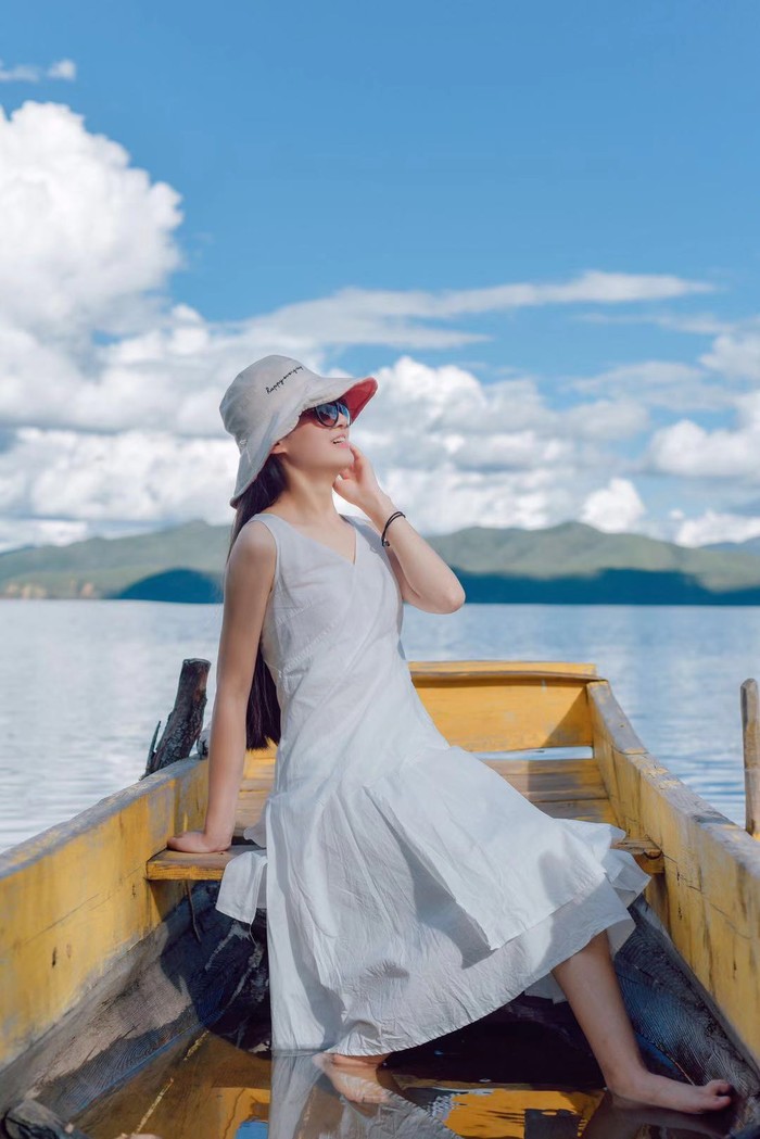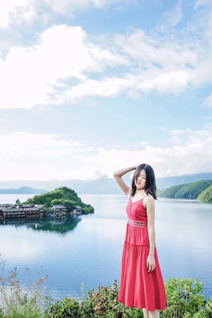 天边飘来几片简单的云,而就是这样简单的云,倒映在湖水里,才给单调的蓝,又添了色彩。但这样的色彩,都不及你的艳丽。你在湖边,这景色好似也添了光,更显得明亮与生机。