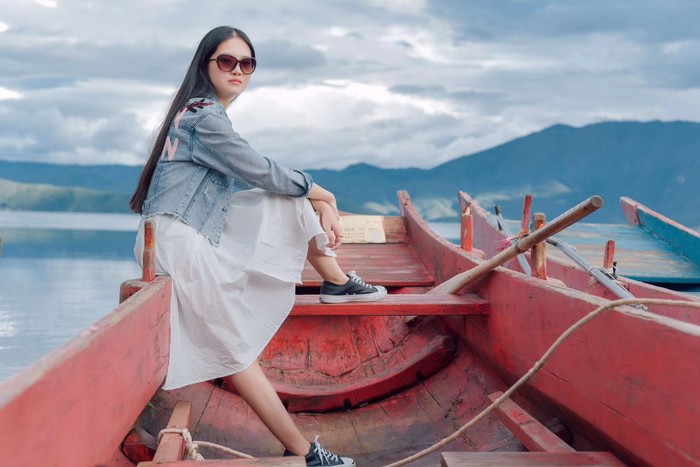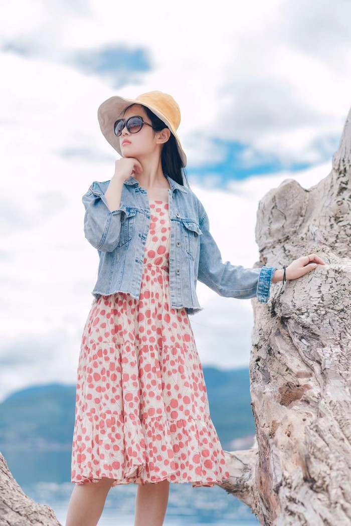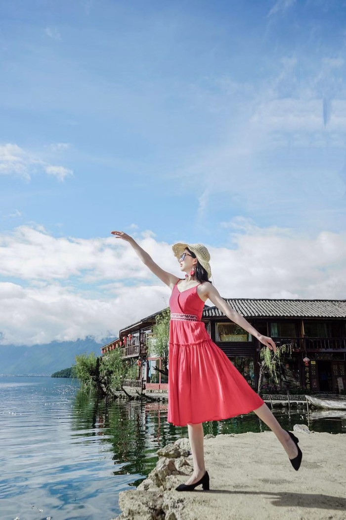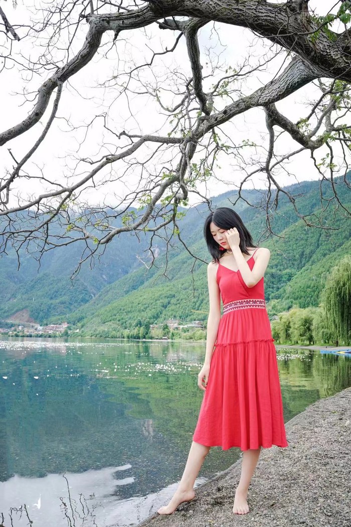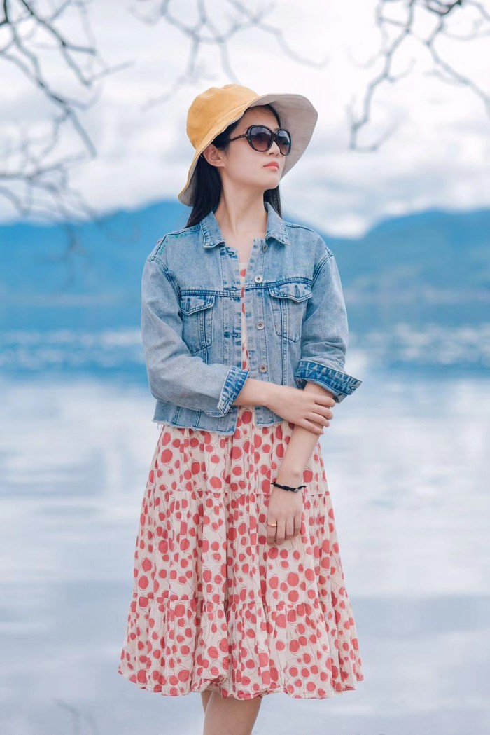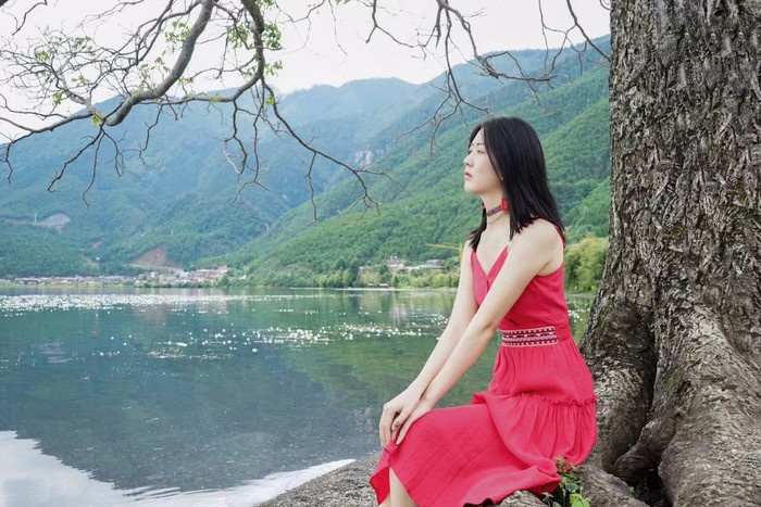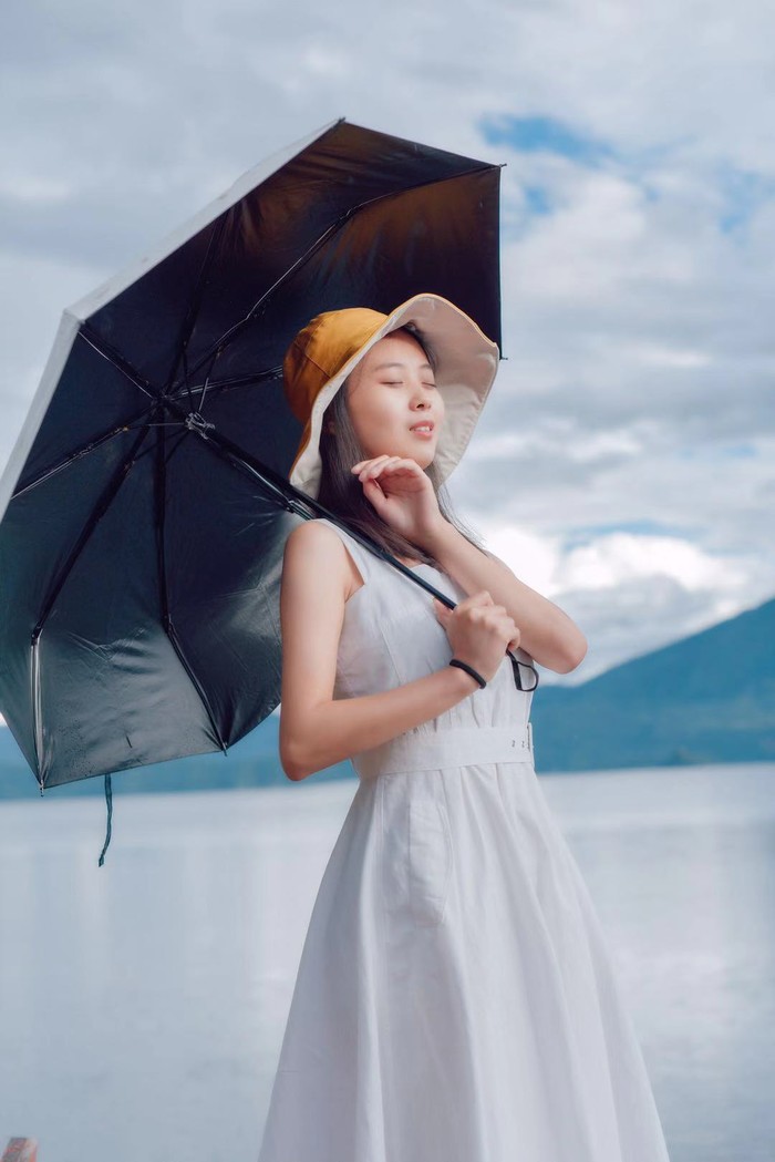 天边飘来几片简单的云,而就是这样简单的云,倒映在湖水里,才给单调的蓝,又添了色彩。但这样的色彩,都不及你的艳丽。你在湖边,这景色好似也添了光,更显得明亮与生机。