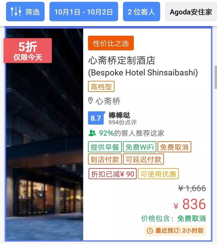 agoda上1晚价格为836元,住2晚,用上满1500-200的优惠券,算下来1晚便宜了100元!