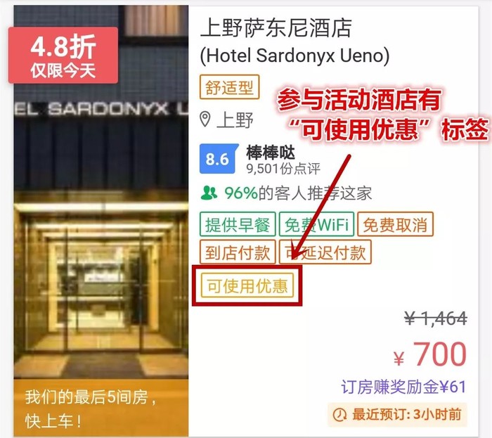 但需注意,有“可使用优惠”标签的酒店才参与了此次活动。