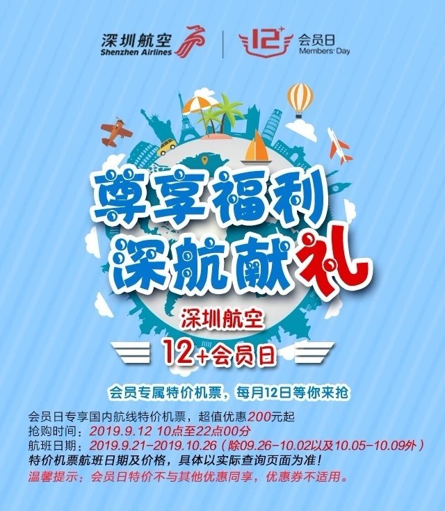 深圳航空本次促销包括200条航线,近5000个航班。覆盖深圳、广州、南京、南宁等始发地域。