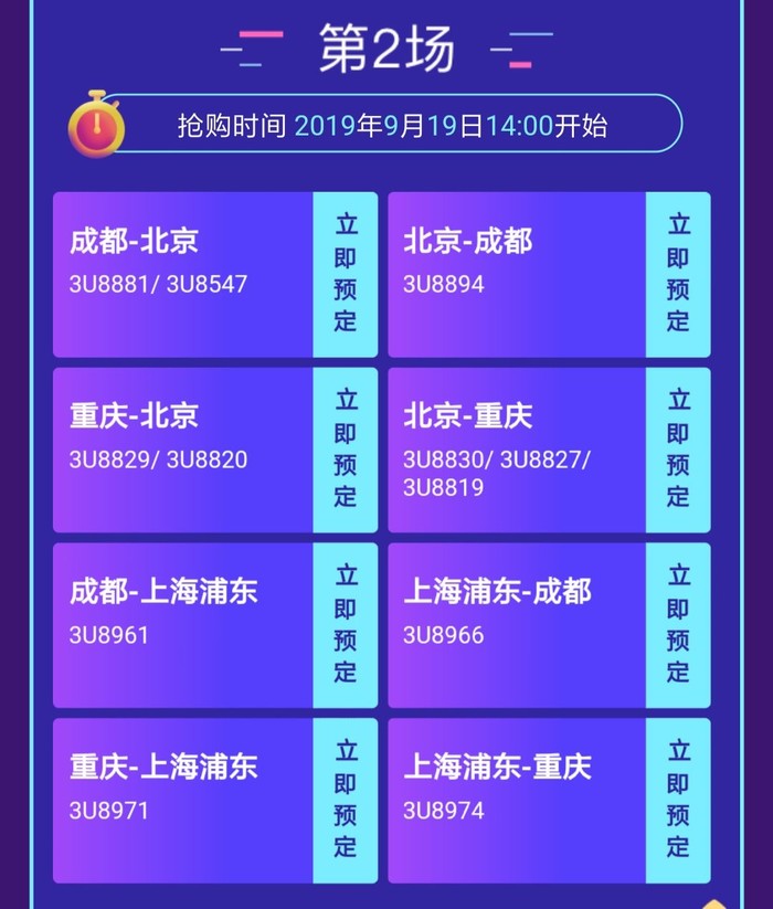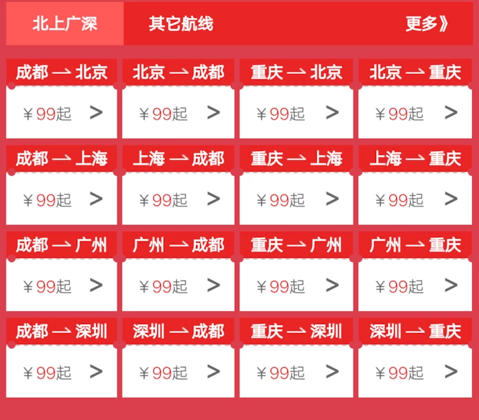 川航国内部分 自营航线折上8折起川航国际部分 自营航线直减20%活动适用舱位经济舱Y、T、W、H、M、G、S、L、Q、E、V、R舱温馨提示,国际折上直减航线仅适用于往返航班,单程航班不享受折上直减优惠