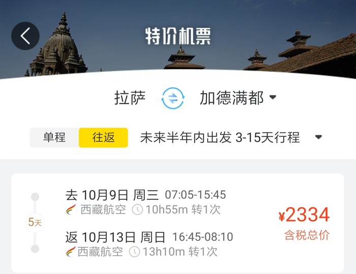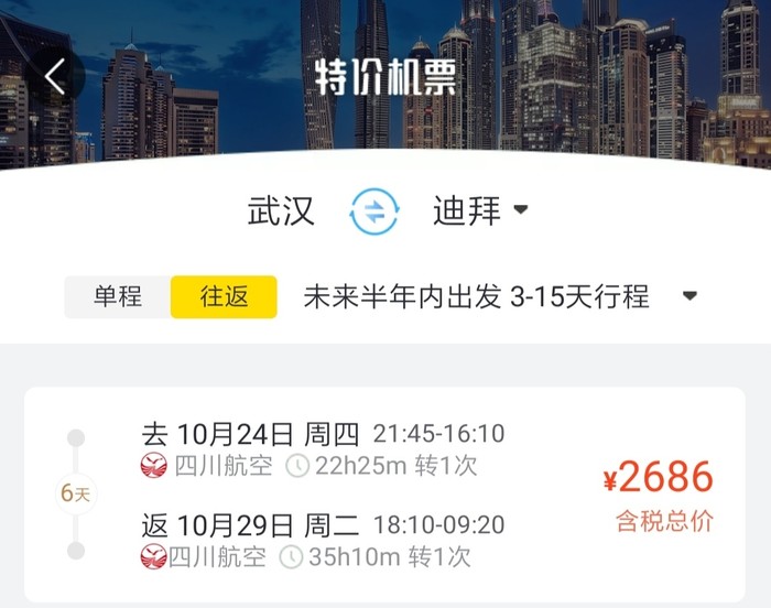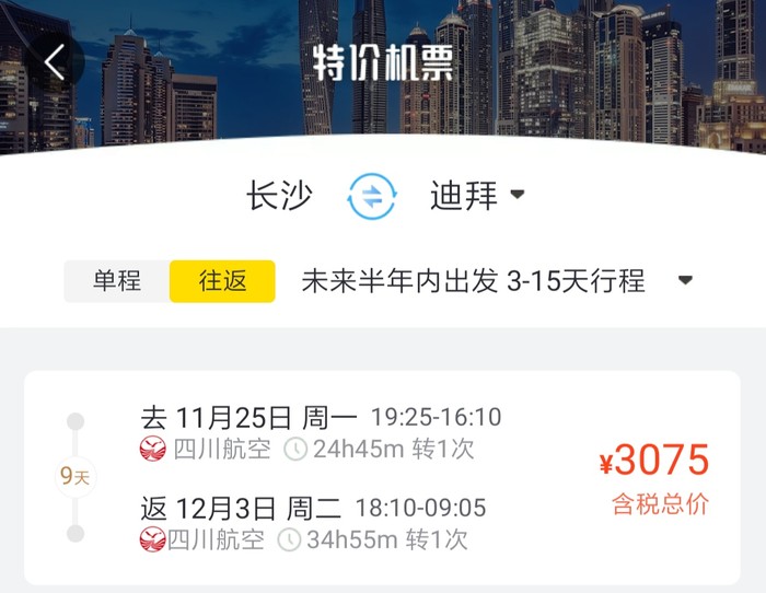 飞猪给出半年内最低价格为2325元。虽然价格差不大,但是!川航给出的是直飞的价格。飞猪给的价格航线需要往返中转,往返直飞的价格几乎都在4000+。