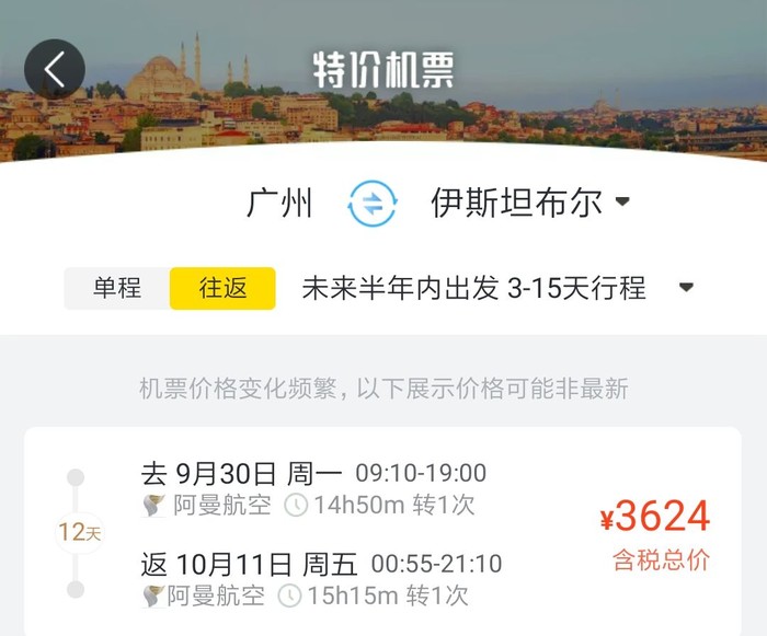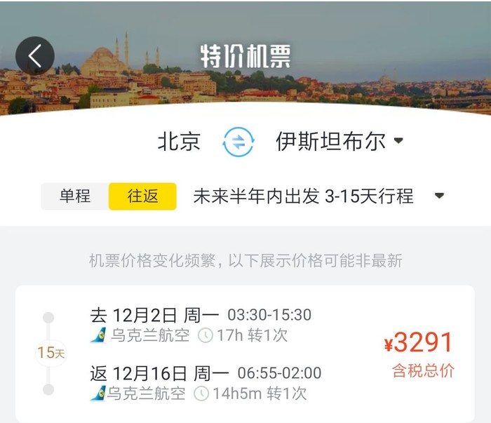北、上、广往返伊斯坦布尔含税价2369。目前机票还是比较充足的,飞猪近半年最低价格都在3000+。建议入手!
