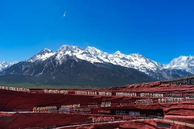 由张艺谋导演的大型实景真人演出印象丽江。演出场地就在雪山景区内。巨大的舞台以雪山为背景,在修建时也耗费了不少的人力、物力和财力。可想在这个舞台上的表演都是些怎样经典和震撼的民俗舞蹈。