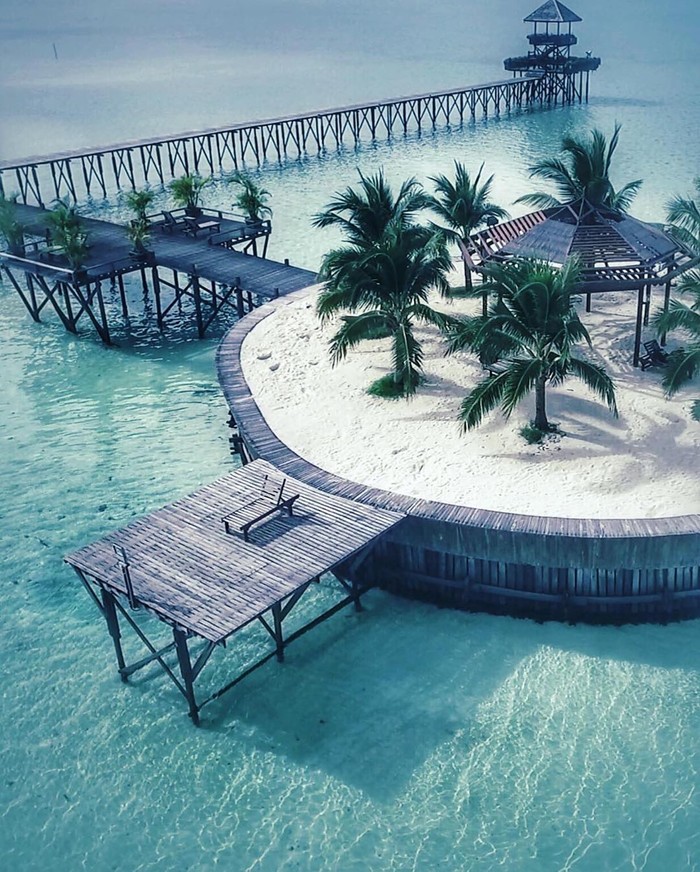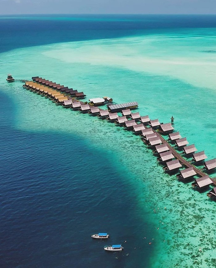 这里有50多座水上别墅,踩高跷一般伫立在海面上。小屋之间由木板栈道连接,走在上面,看着茫茫海风裹起海浪,仿佛漂浮在海面上一样。更别提它比马尔代夫低到一半的价格,让它成了无数情侣的蜜月首选。