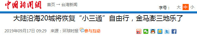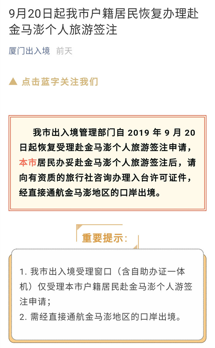 据环球时报:金门县政府16日晚宣布,大陆出入境管理部门公告自20日起恢复受理20个海西城市居民赴金门、马祖、澎湖“小三通”个人旅游签注申请。