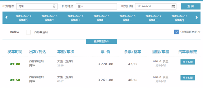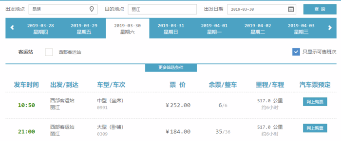 对比汽车票(信息来自云南票务网),昆明出发去丽江、芒市、腾冲,汽车票价格基本都在200以上,祥鹏的机票秒杀更便宜。虽然还有包车之类的方法,但这里就不给大家展开了,可以自己做做功课噢~