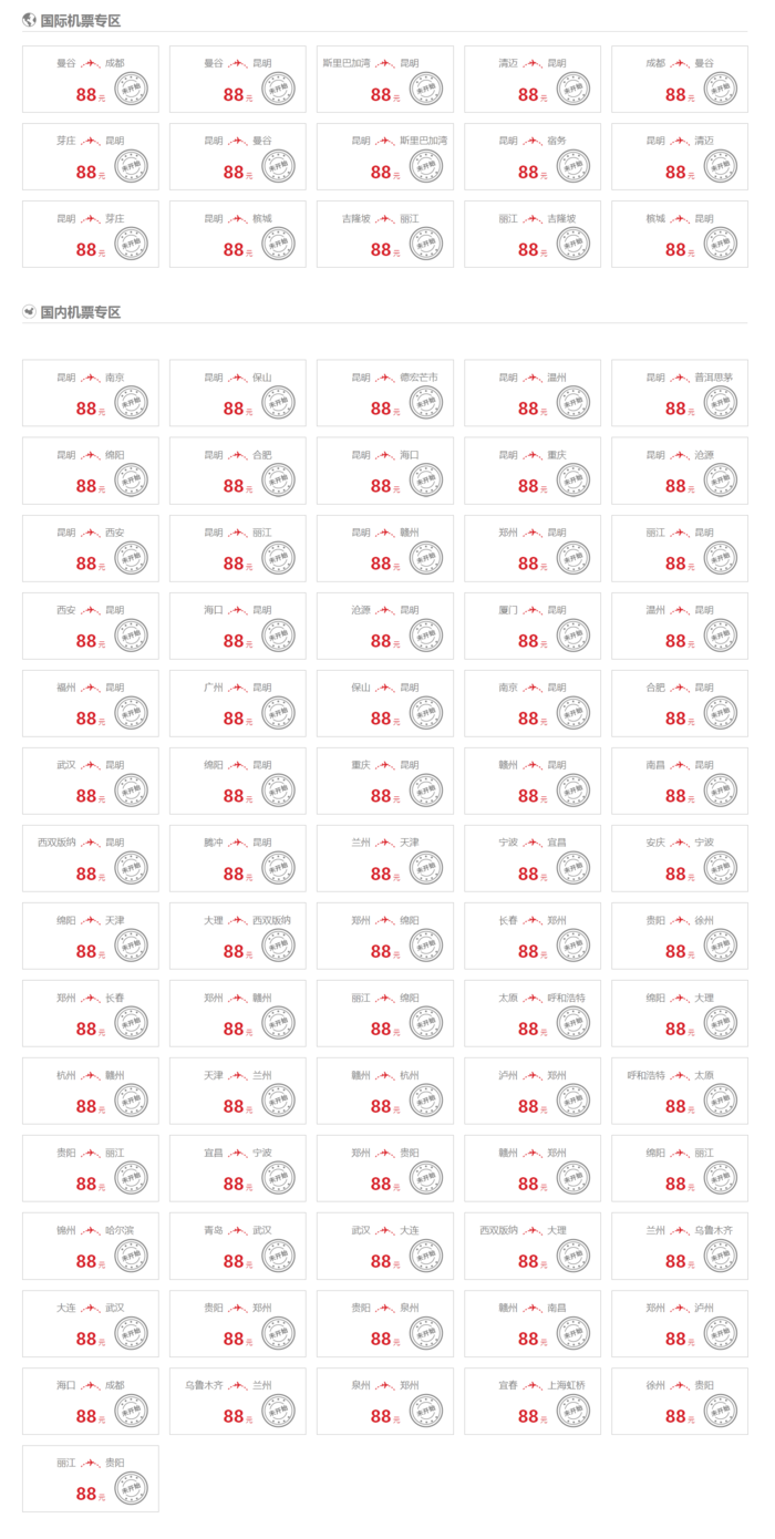 国内航线秒杀票价一般都是88元,加上50元的税,才138元!