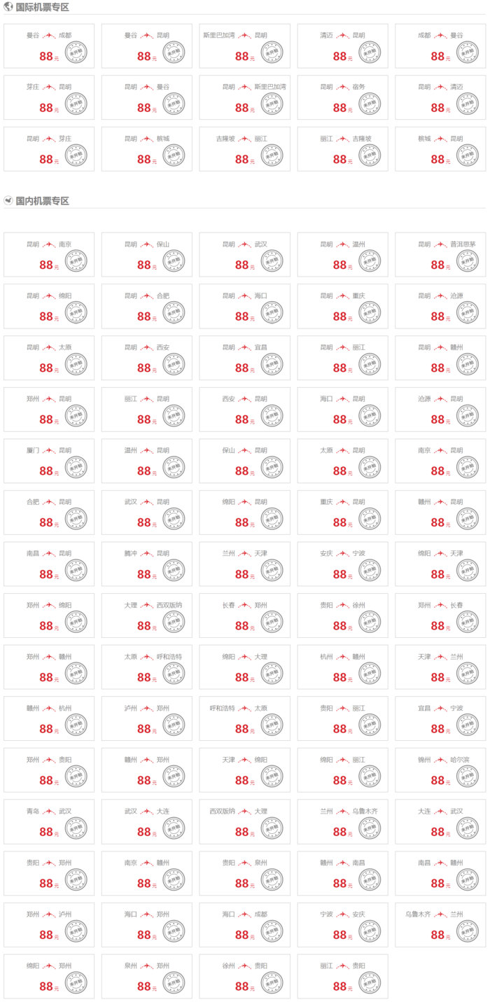 国内航线秒杀票价一般都是88元,加上50元的税,才138元!