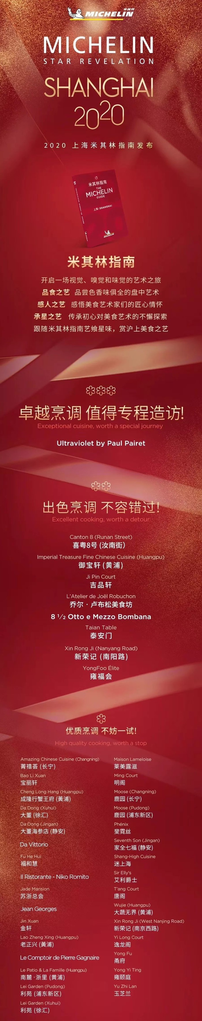 从2016年到2019年,上海米其林指南步入第四个年头,2020上海米其林指南今天下午发布,40家餐厅入选。其中,ULTRAVIOLET by Paul Pairet 餐厅依然获得米其林三星。吉品轩、泰安门升级,成为米其林二星餐厅,31家餐厅获得一星。