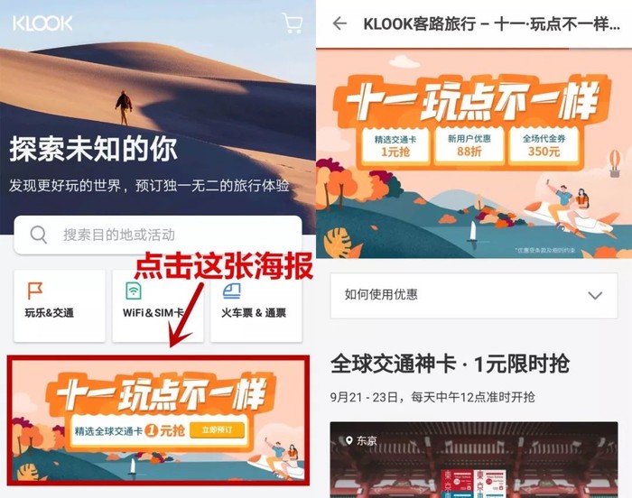 进入KLOOK客路App首页,点击下方示意中红色圈出的橙色海报,往下拉就能看见“全球交通神卡·1元限时抢”。