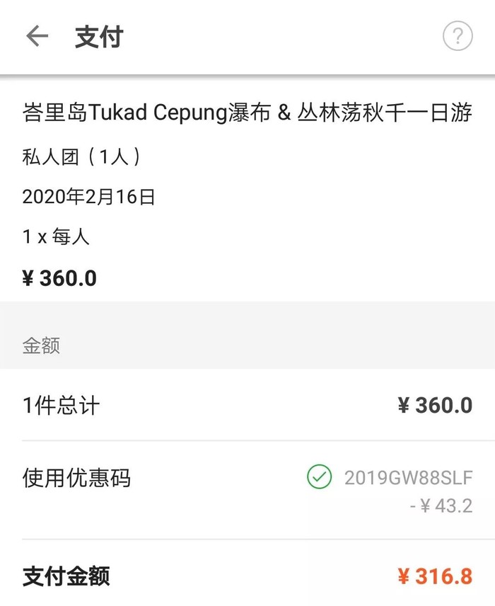 原价为202元,现KLOOK客路优惠价为360元(1人,根据私人团的人数不同价格不同),叠加88折优惠,到手只需319元!直接省了40多块呢~