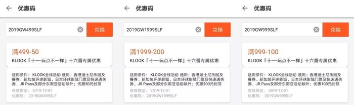凭这3个十六番旅行的专属优惠码:「2019GW499SLF」、「2019GW999SLF」、「2019GW1999SLF」,分别可领取「499-50」「999-100」「1999-200」的优惠码,新老用户均可使用!