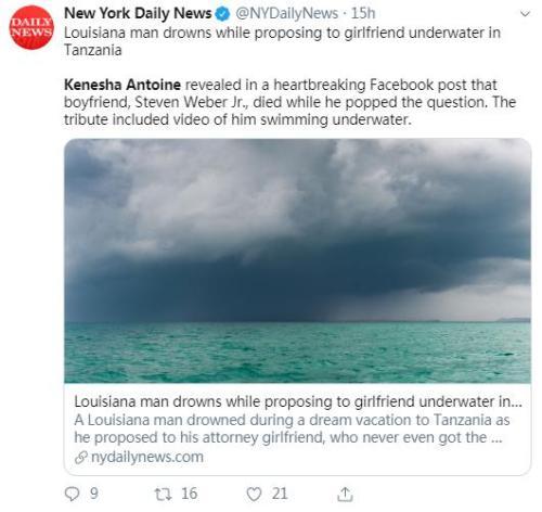 @中国新闻网:据台湾联合新闻网报道,美国男子威伯在坦桑尼亚彭巴岛的曼塔度假村(The Manta Resort)向女友安托万进行浪漫的潜水求婚后,就没再上岸,不幸溺毙水中。