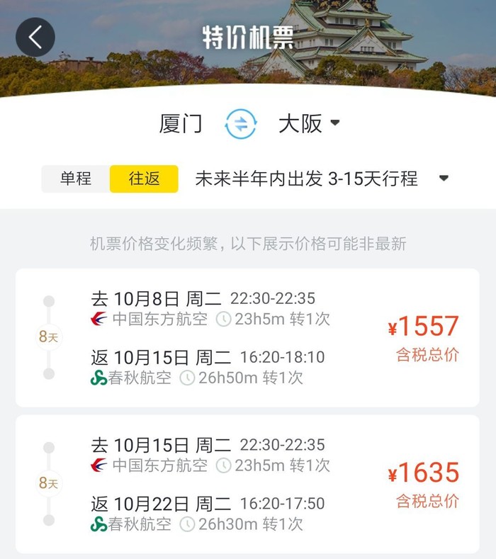 厦门往返大阪飞猪半年内最便宜价格为1557元,购买尾单省下500+
