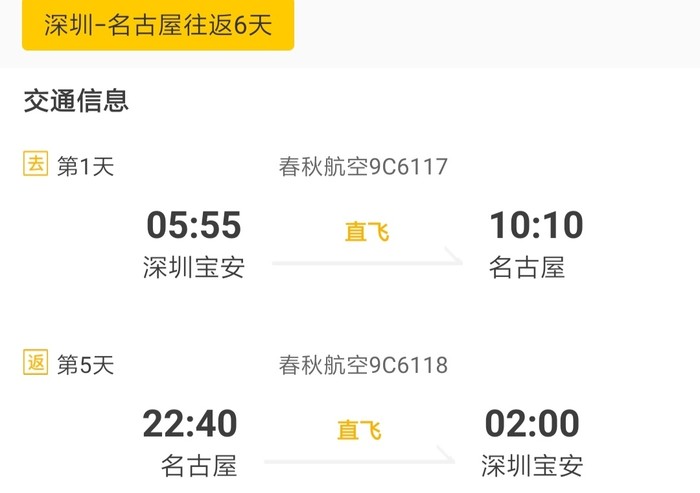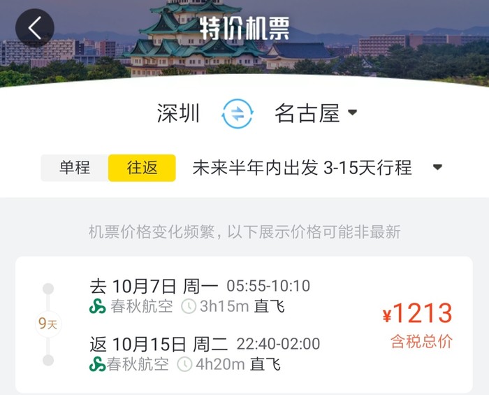 同样是春秋执飞,深圳往返名古屋飞猪半年内最便宜价格为1200+,省下400+.