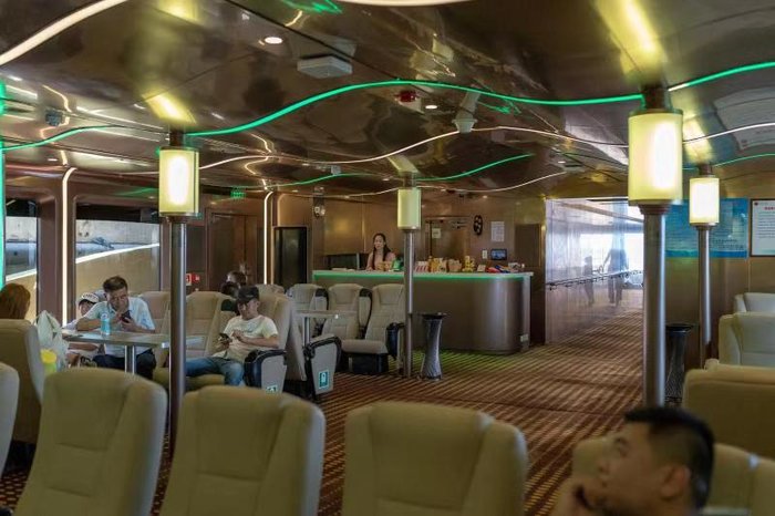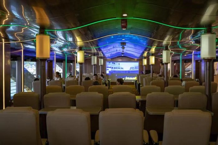 游船的客舱层,完全称得上是周末小资轻奢游的格调。整体空间舒适,随处可见流线型设计风格,顶灯呈蓝黄色,仿佛置身波动的大海之中,能和朋友到访游船,真是幸福!