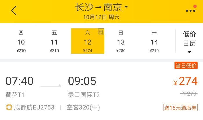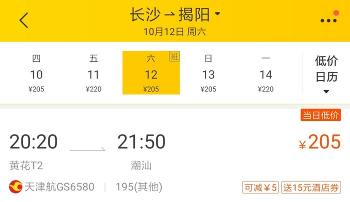 长沙飞揭阳促销日期内不含税最低价为205元。