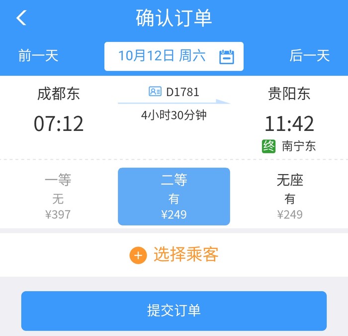 成都-贵阳,动车需要249元,相比之下成都航空的秒杀明显便宜。不过考虑到路途中所消耗的时间,大家可以自己取舍一下。