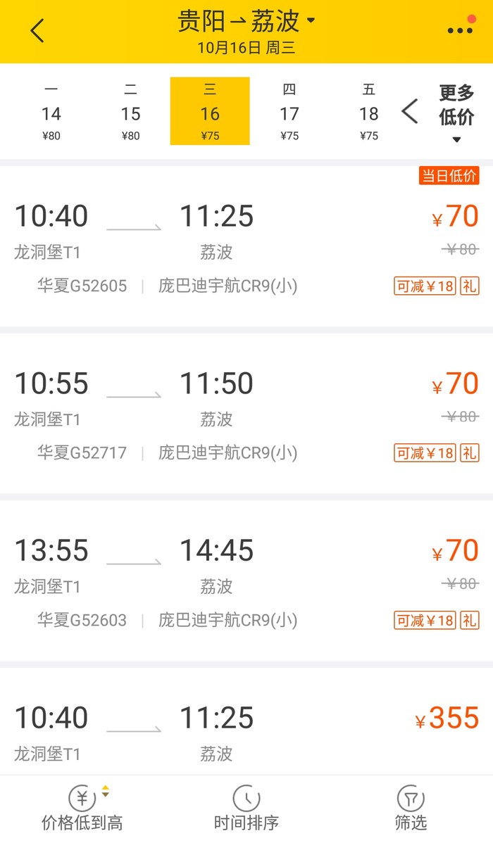 而且华夏航空的秒杀价格对比平时,明显便宜,比如以下贵阳飞荔波航线,网上搜70元,华夏航空秒杀才20元,非常值得关注!