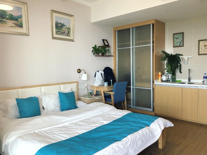 原来定的16楼房源,房东给升级房间了。风格有所不同,17楼的视野开阔,海景净收眼底,房间内布置跟Airbnb上图片一致,内有厨房(可以做简单的烹饪)、冰箱、浴缸、洗衣机,设备人性化。