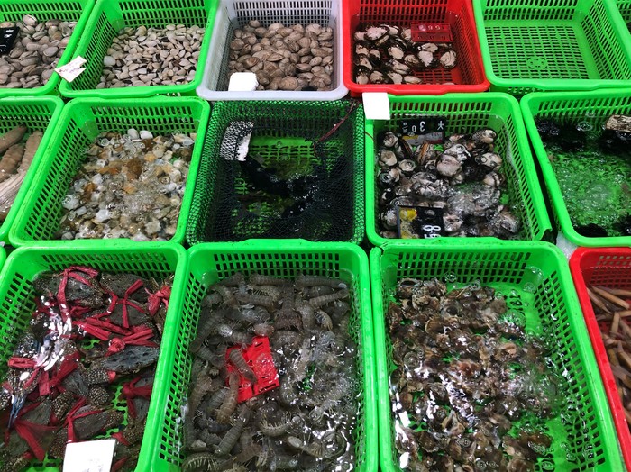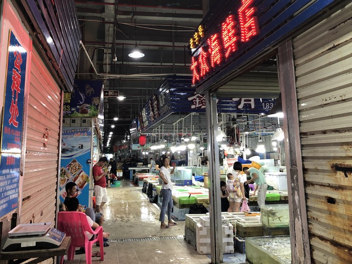 海世界人不多,沙子细腻,路上想起在普吉岛的那段时光。嘻嘻哈哈地沿着海边慢慢散步。偶然间还碰到先生的同事一家,一起约上到了海鲜批发市场。