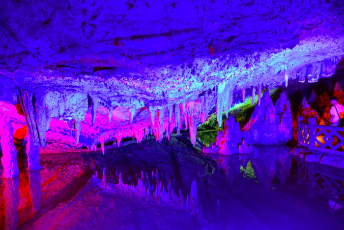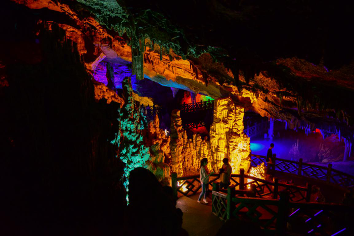 猿王洞不管怎么拍都能让人感受到大自然的鬼斧神工,洞里有许多钟乳石,每根钟乳石都有彩灯照着,真是五彩斑斓,美丽极了,钟乳石千姿百态,就像一根倒挂的笋。