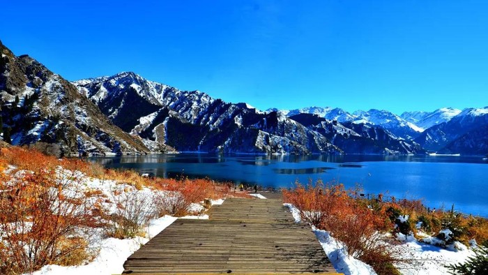 古称“瑶池”,是天山博格达峰北侧的一个半月形湖泊。湖水晶莹如玉,倒映着博格达峰,四周群山环抱,山上布满了挺拔、苍翠的云杉、塔松,漫山遍岭,风景犹如仙境。