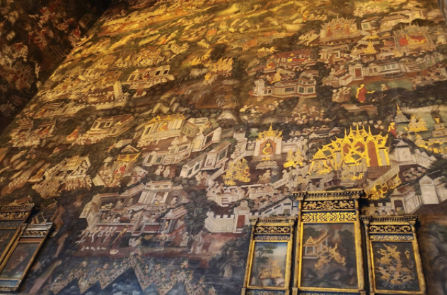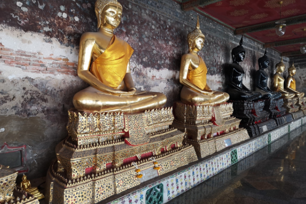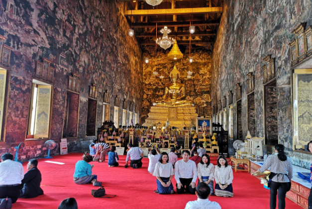 不过,秋千早就被废止了,如今屹立在广场门前的只剩下了一个红色框架。被长949米的玻璃围墙所包围的正是苏泰寺,完美的外形轮廓,与曼谷其它寺庙想必,毫无媲美性可言。据说寺庙内还有尊13世纪时期的青铜佛像,还是从苏霍泰运送过来的。寺内墙壁上全是彩色壁画,描述的是佛祖一生的故事。