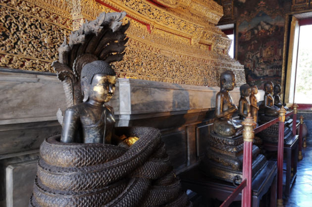 寺庙建筑非常有条理性,旁边还有中国塔和中国石雕。主殿刚好修缮完成。走进主殿全是佛像,最引人注意的就是那角落中的黑佛了,由于这的佛像大多为金黄色的,突然间有那么几尊黑佛,还有些突兀。就连他们的坐台也都是黑色的,简直是黑的发亮。