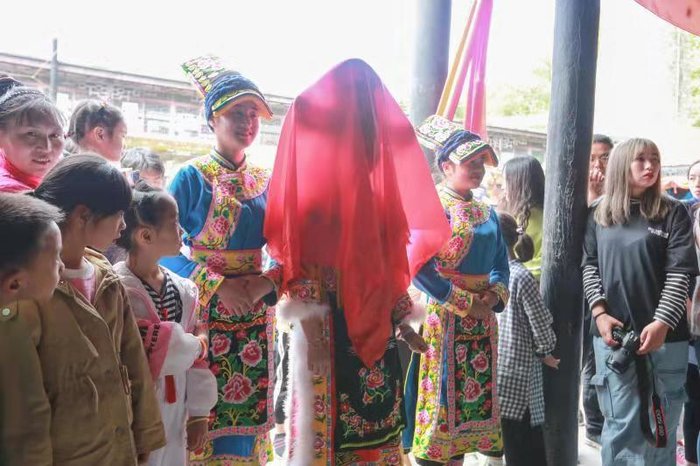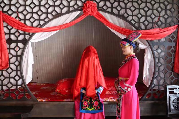 新娘坐在床边等着新郎及游客扮演的接亲团来迎接,最主要的不是坐车,而是由四个游客扮演的轿夫抬着花轿来迎接的,哎呀,我好喜欢这种感觉的