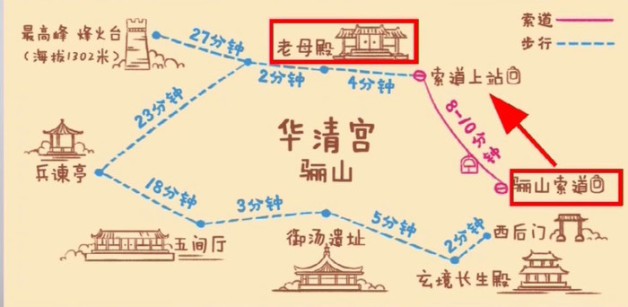 然后,进入骊山风景区,骊山海拔有1302米,上山台阶有3200多级,建议索道上山到老母殿,然后步行登顶烽火台,再步行下山到兵谏亭。