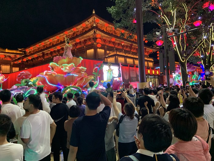 从大慈恩寺出来的大雁塔南广场对面就是大唐不夜城,大唐不夜城不建议早上逛,晚上才是它最漂亮的时候,你会看到灯火璀璨、歌舞升平。这时候,你可以到旁边的大悦城商场逛一下,里面有一家西安最最最著名的网红店“长安大牌档”,如果你要吃,不早点去,估计排队就要一两个小时。或者在大唐不夜城里有著名的老字号“同盛祥”、唐猫庭院等各种餐厅,都值得一试(这些都会在稍后的美食攻略中介绍)。