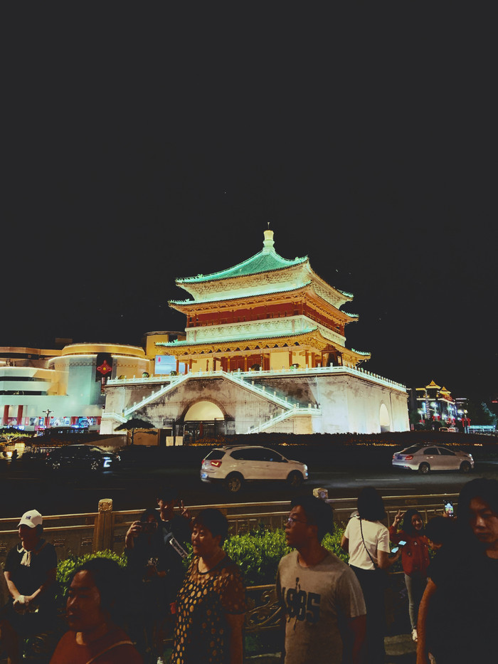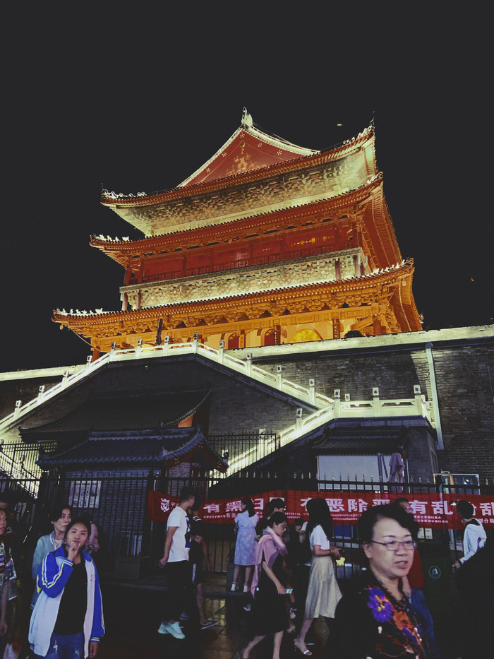 从城墙下来估计也肚子饿了吧。可以到回民街大吃特吃了。去回民街的路上,你会看到钟楼、鼓楼,夜晚这两栋建筑并没有淹没在黑暗中,相反在灯光的映衬下,显得格外耀眼夺目。两座楼白天可以登上去参观票价35元,有时间的话上去一趟也是不错的哦。