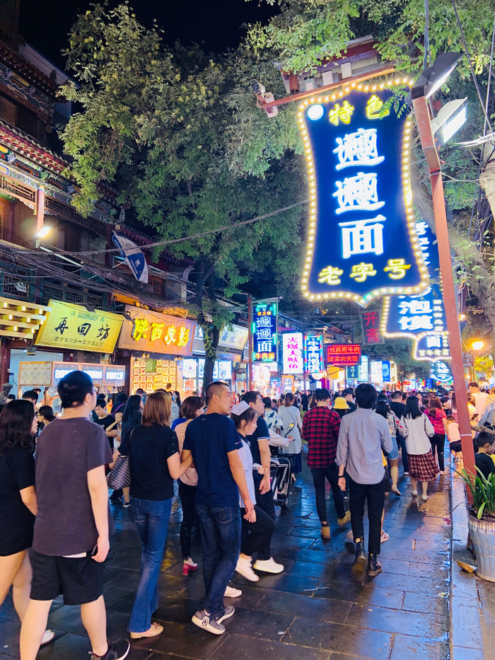 回民街是西安著名的美食文化街区,是西安小吃街区。进入回民街主路,人山人海。虽然很多游记和当地人都会说,回民街的小吃贵,人又多,不推荐去。但是,我想说的是,这里虽然人多、食物贵但是还是值得走一趟。晚上的回民街,每一家店都灯火璀璨,点亮了整条回民街的大街小巷。回民街人虽然多,但是街道干净整洁,店铺有序规划,不得不为当地政府点赞。