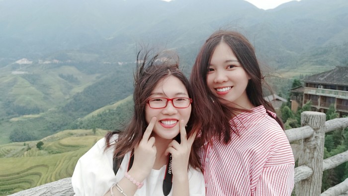 【风景篇】出发前,我们最期待的是龙脊梯田,期待它金黄金黄的一片,期待它的壮观。可是时间选的还不够好,当时的禾还处于黄绿黄绿的尴尬之中,所以也拍不出理想的照片。因为处于当地旅游的旺季,跟团时间也比较紧,所以上下梯田我们都选择了缆车。(感觉是个明智的选择,哈哈~)在山顶,风很大,拿着自拍杆拍照的时候就像记者在台风中实时报道一样,拍出来的照片就像两个疯女孩,