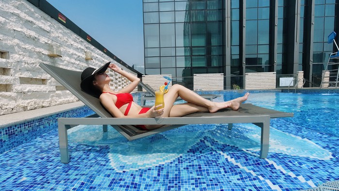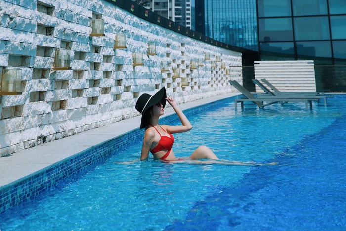 次日上午,你绝对不能错过酒店的室外露天泳池,位于酒店十一楼空中花园,环境得天独厚,享受阳光的眷恋与蓝天白云的诗意,网红小姐姐畅泳之余也趁机打卡,随手一拍浓浓度假风情。