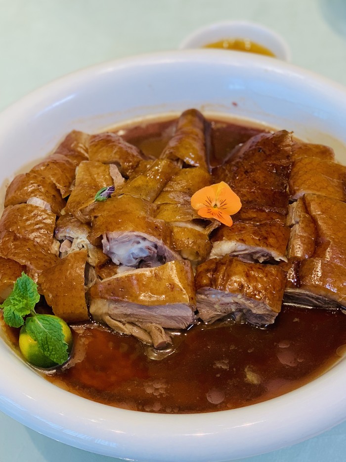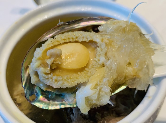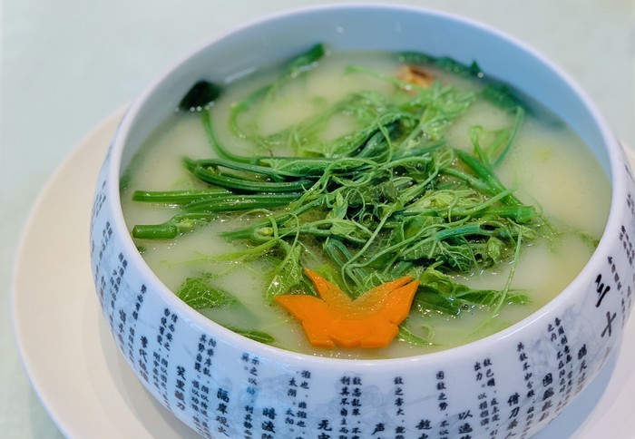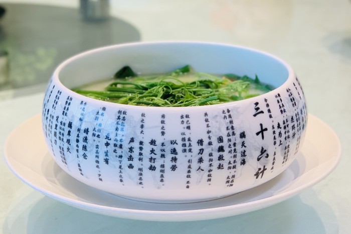 这里的出品传统与创新相结合,多款招牌菜给我们留下极深的记忆点:金牌灌汤烧鹅、菠菜汁野米烩辽参、灵芝鲜鲍功夫汤等等每款出品都是可圈可点,而且器皿也是极具典雅特色,比如上汤南瓜苗的器皿,三十六计,让我们耳目一新。