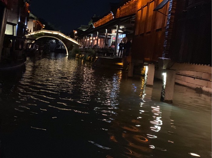 本来想着去酒吧街吃饭喝酒看表演的,但逛街的时候被饭店的龙船酸菜鱼吸引了,就直接去那家店吃了,酸菜鱼分量还行,味道跟广州吃的酸菜鱼有点不一样,挺好吃的~如果喜欢酸菜鱼和椒盐猪手的,这家推荐推荐。晚饭后已经六点多了,东西栅是晚上十点就不能待里面了的,而我们还要坐船游夜景,所以酒吧和乘船只能择其一了。酒吧街哪里都有,而乌镇西栅夜色美景独一无二,所以我们最终选择去乘船。乘船是统一价格,很多地方都有码头,可以包船也可以拼船~