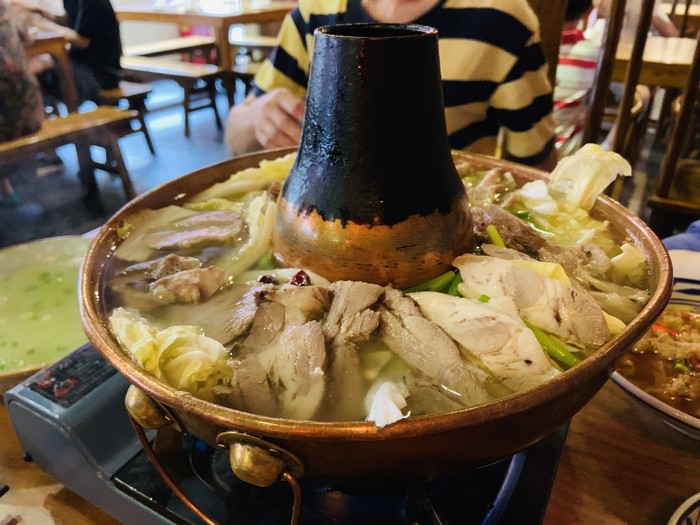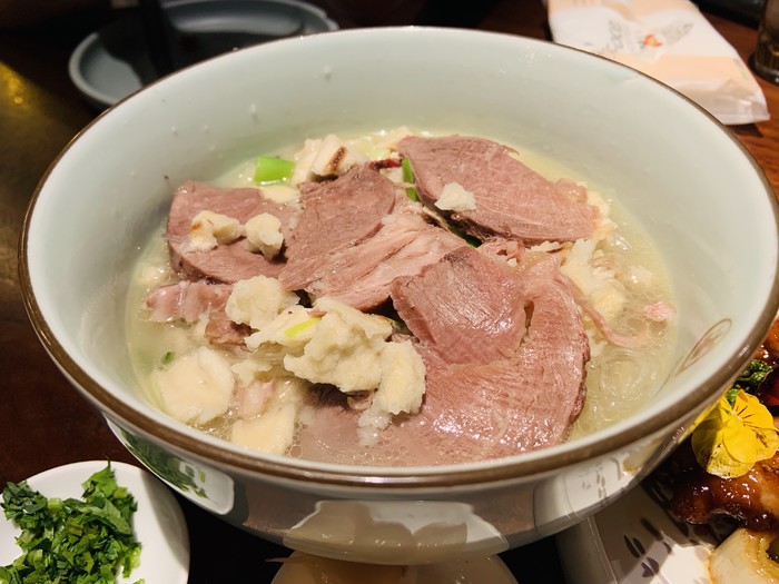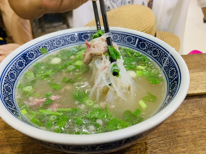 【羊肉水盆】把羊肉切片,跟粉丝放入碗里,再浇上一大碗清汤,还有香菜、葱,清香四溢,听说羊肉水盆一般配同烧饼一起吃,但按照南方人的胃口,其实不用配烧饼就已经饱饱了的。