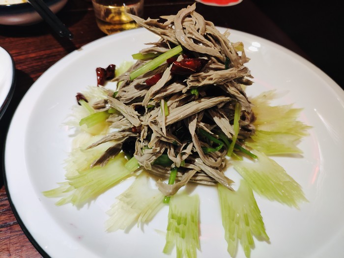 【凤尾脆芹】其实就是凉拌腐竹芹菜,造型摆放细巧,清淡爽口,非常适合做下酒菜。
