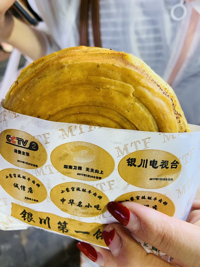 【宫廷酥牛肉饼】真的很好吃。拿到手热热的,脆脆的酥皮里面是牛肉菜陷,味道真的很棒,那可是上过 银川电视台的。