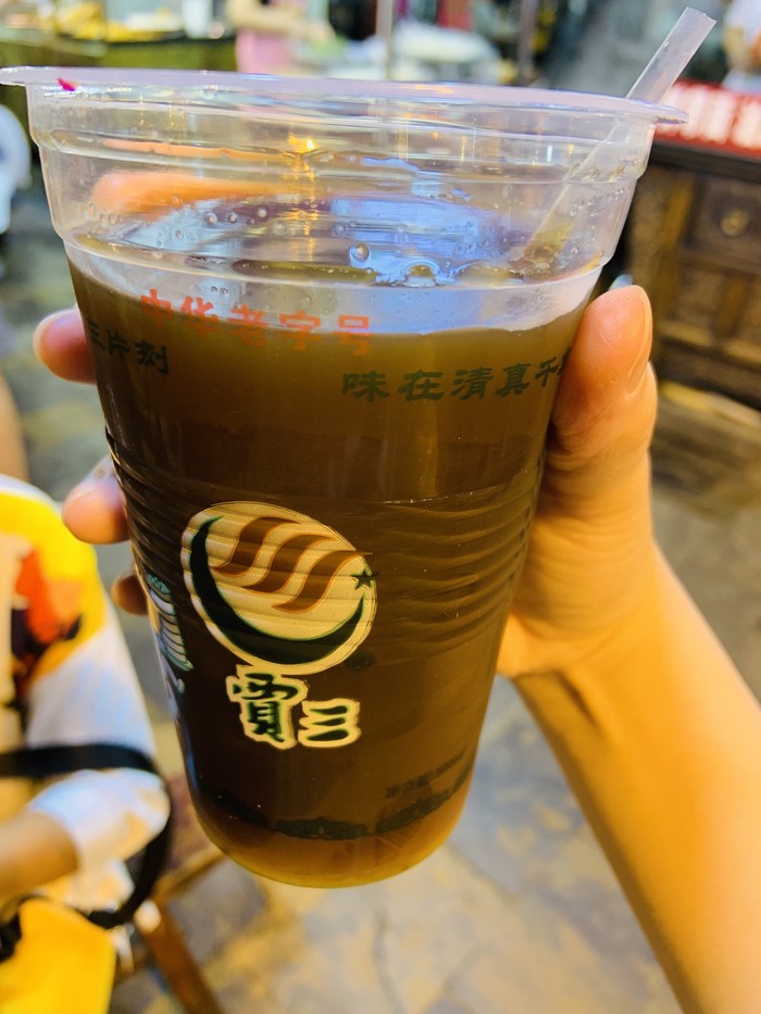 【酸梅汤】看过主路上的酸梅汤,大多都是紫色,并不正宗,而且还贵。到小巷子里买到的酸梅汤,汤水是浑浊的棕色,喝起来有一股淡淡的烟熏味,这才叫正宗,而且价格便宜,我买的这杯才5块钱。