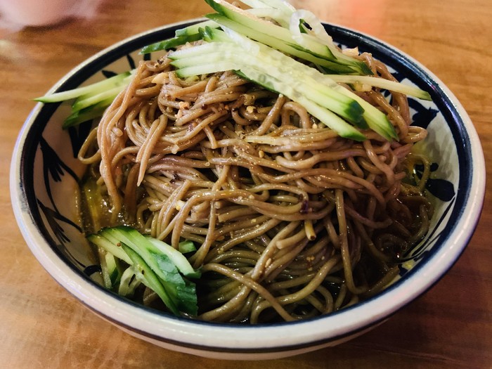 【蓝田饸硌】凉菜,面条是荞麦制成,因糖分含量少,粗纤维多,利于消化,对糖尿病有明显的疗效,此品为 陕西 著名小吃,第一次吃稍微有点吃不惯。