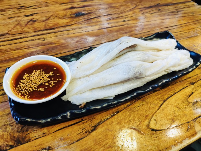 【双色素卷】面粉皮包着土豆丝,本没什么特别,但是配上了辣椒酱料,吃起来真的超级美味。