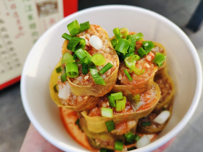 【山阳江米腊肉糕】腐皮包裹着糯米饭团,很多人应该会叫它烧麦吧。