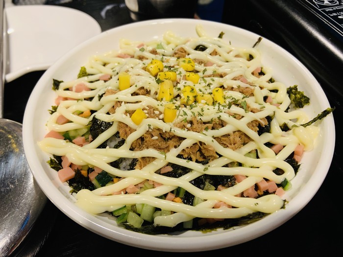 【金枪鱼饭团】也是里面的必点项,服务员会给到手套我们,拌匀了以后用手抓起来吃,金枪鱼碎、蔬菜丁、海苔、 沙拉 拌饭,加强亲手捏成饭团,推荐、推荐。